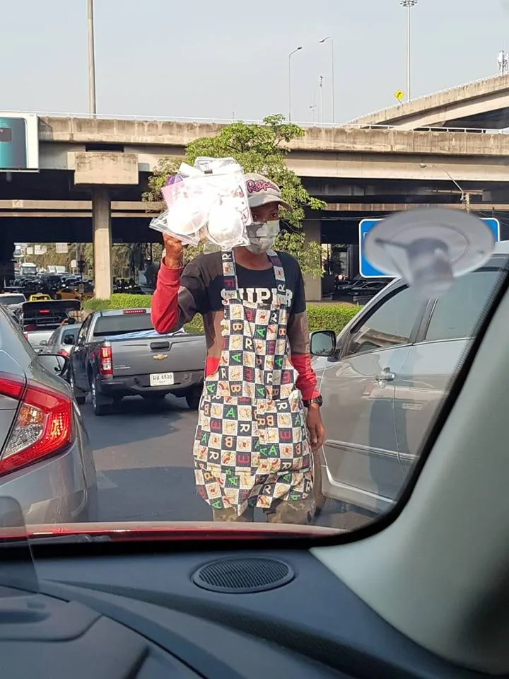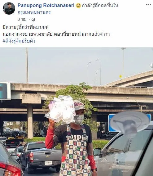 ล่าสุด ผู้ใช้เฟซบุ๊กชื่อ Panupong Rotchanaseri ได้ออกมาเผยภาพที่เรียกได้ว่า เป็นการปรับตัวของคนในพื้นที่จริงๆ แม้แต่คนขายพวงมาลัยตามสี่แยก ก็ยังเปลี่ยนมาขายหน้ากากอนามัยกันฝุ่นแทน ซึ่งเป็นสิ่งที่จำเป็นในชีวิตประจำวันที่สุด โดยเจ้าของภาพ ได้ระบุว่า "มีความรู้สึกว่าพีคมากก! นอกจากจะขายพวงมาลัย ตอนนี้ขายหน้ากากแล้วจ้าาา#ดีจังรู้จักปรับตัว"