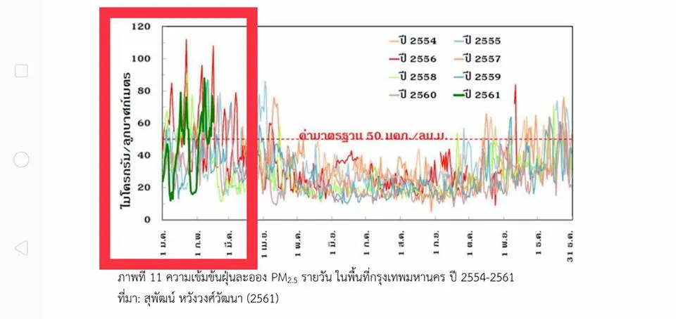 ความจริงคนในกทม.อยู่กับฝุ่น PM2.5 ที่สูงเกินค่ามาตรฐานในเดือนมกราคมถึงมีนาคมทุกปีมานานอย่างน้อย 7 ปีแล้ว ตั้งแต่เริ่มมีการวัดค่า PM2.5 ในกทม.ปีพ.ศ.2554 (ดูกราฟ) บางปีบางวันสูงถึง 110 ไมโครกรัมต่อลูกบาศก์เมตรโดยไม่มีข่าวว่าฝุ่น PM2.5 ส่งผลกระทบต่อสุขภาพของคนในกทม.