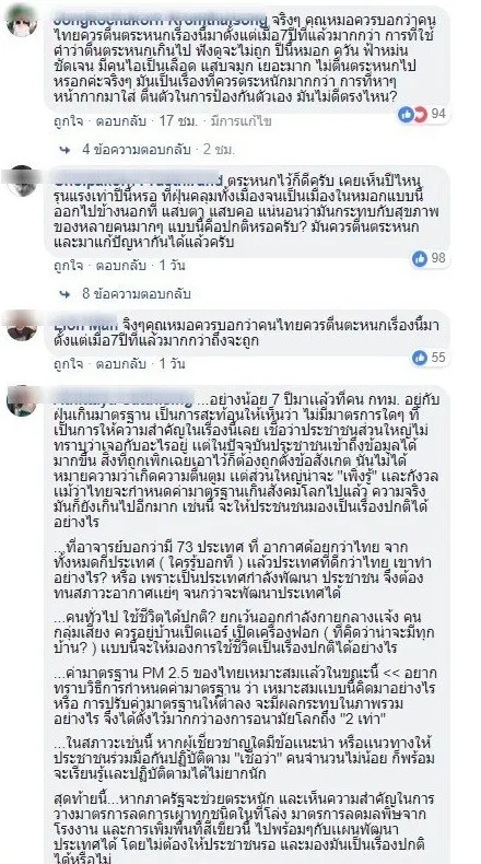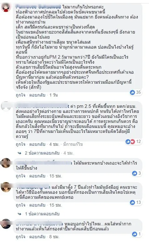 คนไทยต้องติดตามข่าวอย่างมีสติ ไม่ตื่นเต้นตกใจเกินไป บางคนถึงขั้นซื้อเครื่องวัด PM2.5 อย่างพกพา ซึ่งไม่มีสถาบันไหนรับรอง ซื้อสเปรย์บล็อคฝุ่น PM2.5 มาพ่นรอบใบหน้าเพื่อป้องกันฝุ่นเข้าจมูกปอด ซื้อแผ่นกรองปิดจมูก เป็นการเสียเงินทองโดยใช่เหตุ เราอยู่กับฝุ่น PM2.5 มานานกว่า 7 ปีโดยไม่เป็นอะไร ช่วงม.ค.-มี.ค.ค่า PM2.5 จะขึ้นๅลงๆเกินค่ามาตรฐาน อีก 2 เดือนค่า PM2.5 ก็จะลดลงเหมือนเช่น 7 ปีที่ผ่านมา