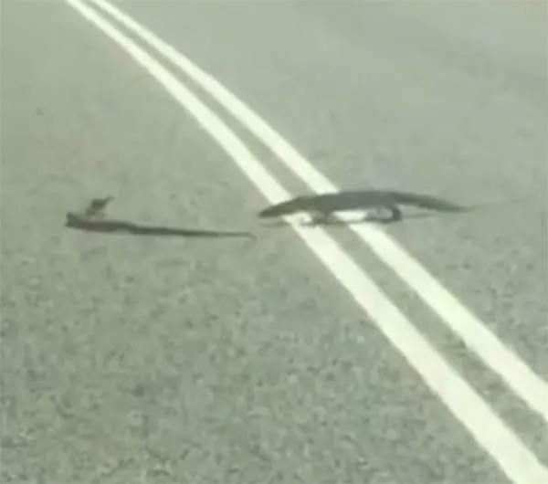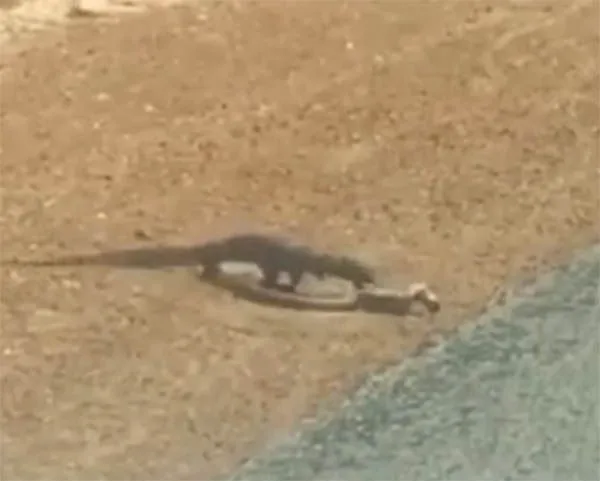 แต่หลังจากนั้นไม่นาน ดูเหมือนว่า เจ้างูตัวนี้จะหมดแรง มันพยายามหนีกิ้งก่า พวกมันลงไปบริเวณไหล่ถนน