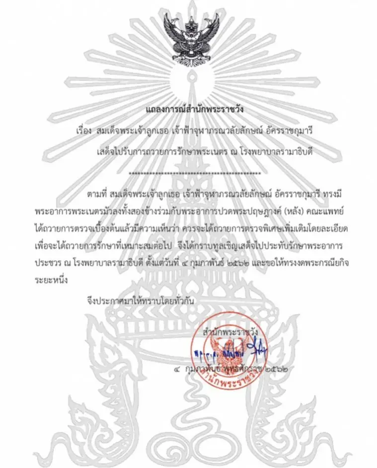 เหมาะสมต่อไป จึงได้กราบทูลเชิญเสด็จไปประทับรักษาพระอาการประชวร ณ โรงพยาบาลรามาธิบดี ตั้งแต่วันที่ ๔ กุมภาพันธ์ ๒๕๖๒ และขอให้ทรงงดพระกรณียกิจระยะหนึ่ง