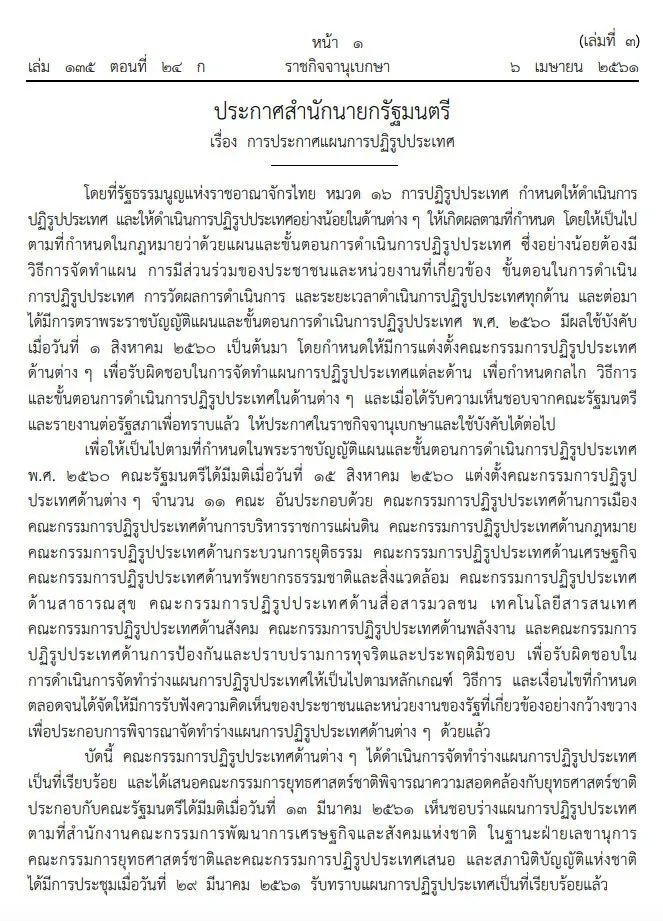 ซึ่ง เว็บไซต์ราชกิจจานุเบกษาได้เผยแพร่ประกาศสํานักนายกรัฐมนตรี เรื่องการประกาศแผนการปฏิรูปประเทศ โดยมีเรื่องที่น่าสนใจเกี่ยวกับแผนการปฏิรูปประเทศด้านสังคม เรื่องกลุ่มผู้เสียเปรียบในสังคม หัวข้อการเสริมสร้างศักยภาพผู้สูงอายุในการทำงาน ระบุว่า ขยายอายุเกษียณราชการจาก 60 ปี เป็น 63 ปี โดยในระยะเวลา 2 ปี จะขยายอายุราชการ 1 ปี เพื่อเป็นต้นแบบในการขยายเวลาทำงาน และไม่กระทบต่อการจ้างงานคนรุ่นใหม่ มาทดแทนคนที่เกษียณอายุ แต่จะไม่ครอบคลุมหน่วยงานที่ต้องใช้ศักยภาพทางร่างกาย