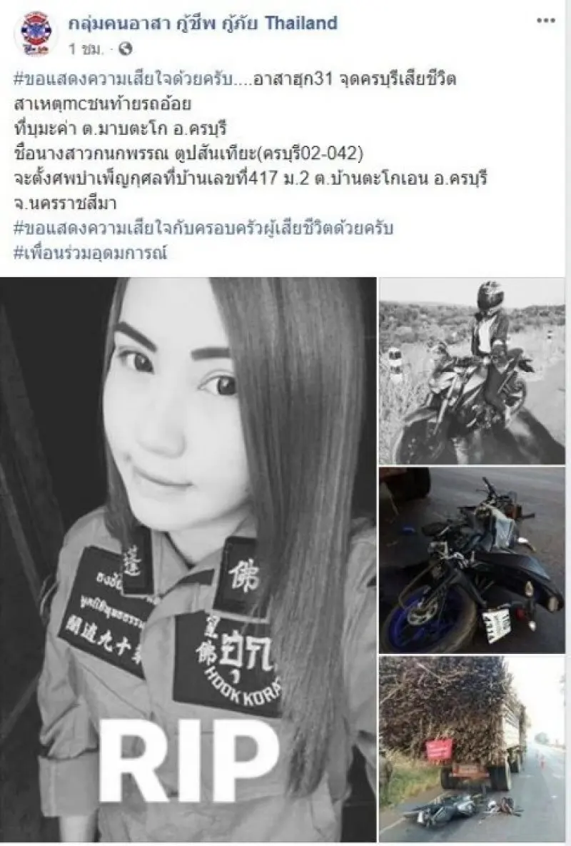 โดยเพจ กลุ่มคนอาสา กู้ชีพ กู้ภัย Thailand ได้โพสต์ว่า #ขอแสดงความเสียใจด้วยครับ….อาสาฮุก31 จุดครบุรีเสียชีวิต สาเหตุmcชนท้ายรถอ้อย ที่บุมะค่า ต.มาบตะโก อ.ครบุรี ชื่อนางสาวกนกพรรณ ตูปสันเทียะ(ครบุรี02-042) จะตั้งศพบำเพ็ญกุศลที่บ้านเลขที่417 ม.2 ต.บ้านตะโกเอน อ.ครบุรี จ.นครราชสีมา#ขอแสดงความเสียใจกับครอบครัวผู้เสียชีวิตด้วยครับ #เพื่อนร่วมอุดมการณ์