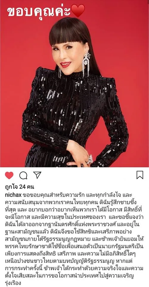 โดยทูลกระหม่อมหญิงฯ ทรงโพสต์ ขอบคุณสำหรับความรักและทุกกำลังใจและความสนับสนุนจากพวกเราคนไทยทุกคน พร้อมย้ำว่า ได้ลาออกจากฐานันดรศักดิ์แห่งพระราชวงศ์ และขอใช้สิทธิสามัญชนในการใช้เสรีภาพอย่างสามัญชน และไม่มีอภิสิทธิใดๆเหนือปวงชนชาวไทย ขอทำงานรับใช้ประเทศชาติด้วยความทุ่มเทเสียสละ นำพาประเทศไปสู่ความเจริญรุ่งเรือง