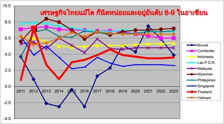 2. เศรษฐกิจไทยในช่วงปี 2558-2561 เพิ่มขึ้นบ้างก็เพราะผลพวงของการเพิ่มขึ้นทั่วทั้งภูมิภาค แต่ไทยโตเป็นอันดับรองบ๊วย คืออันดับที่ 8 จาก 10 ประเทศอาเซียน ที่อันตรายกว่านั้นก็คือ IMF ได้คาดการณ์เศรษฐกิจไทยไว้แล้วว่า ในช่วงปี 2562-2566 เศรษฐกิจไทยจะมีอัตราการเจริญเติบโตตกต่ำลงมาเป็นอันดับที่ 9 ชนะเพียงสิงคโปร์เท่านั้น แสดงว่าทางราชการไม่ประสบความสำเร็จในการแก้ปัญหาเศรษฐกิจชาติหรือไม่