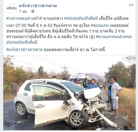 เพจแจ้งข่าวชาวสารคาม รายการว่า เวลา 07.00 วันที่ 8 ก.พ.62 รับแจ้งจาก รพ.ภูเวียง ขอนแก่น เหตุรถยนต์ชนรถยนต์ มีผู้ติดภายในรถ มีผู้เสียชีวิตที่เกิดเหตุ 1 ราย บาดเจ็บ 2 ราย ทราบต่อมาว่าผู้เสียชีวิต คือ น.ส.ภุมลิน วิชาระโช (ปู) เป็นนางเอกหมอลำดาวรุ่งคณะประถมบันเทิงศิลป์ โดยรถที่เธอขับมา เลขทะเบียน 427 ซึ่งรวมกันได้ 13 เป็นเลขไม่ดี แปลว่าความตาย หรือ ผี งานนี้ทำให้ชาวโซเชี่ยลมองว่า อาจจะมีผลทำให้เกิดความสูญเสียครั้งนี้ก็เป็นได้