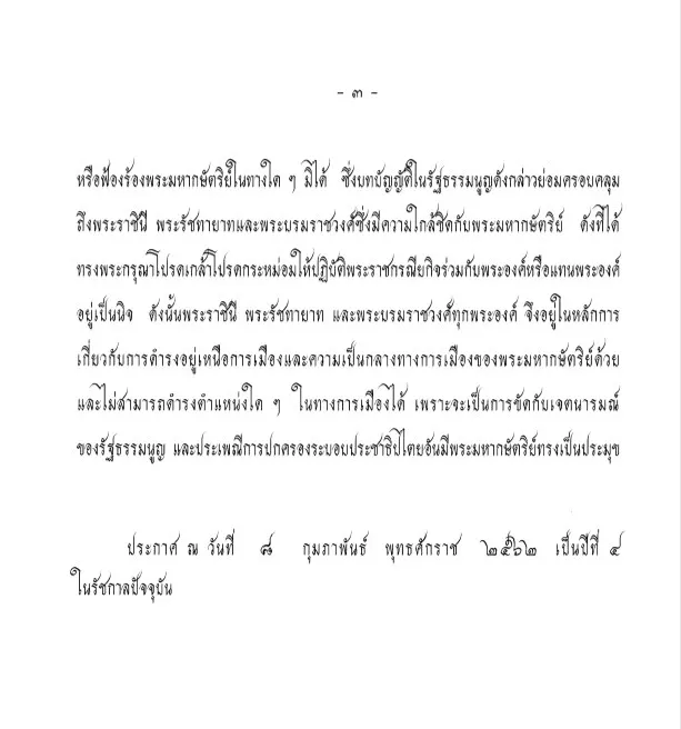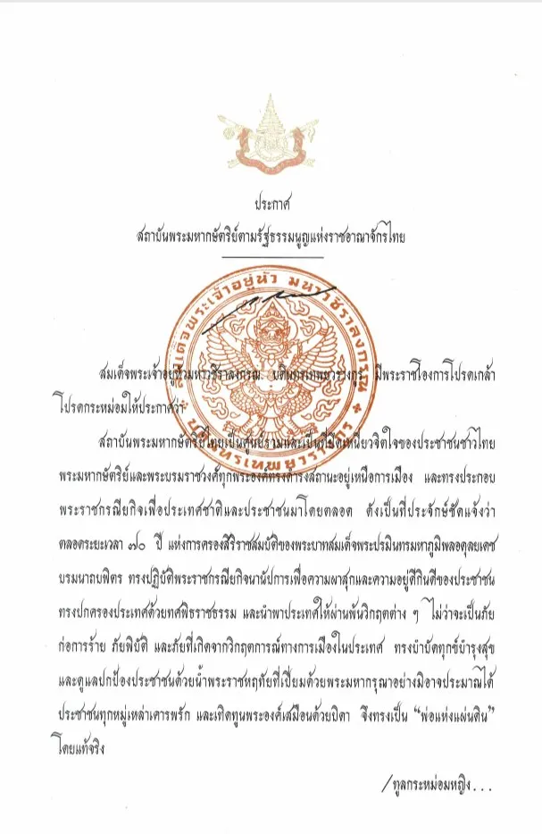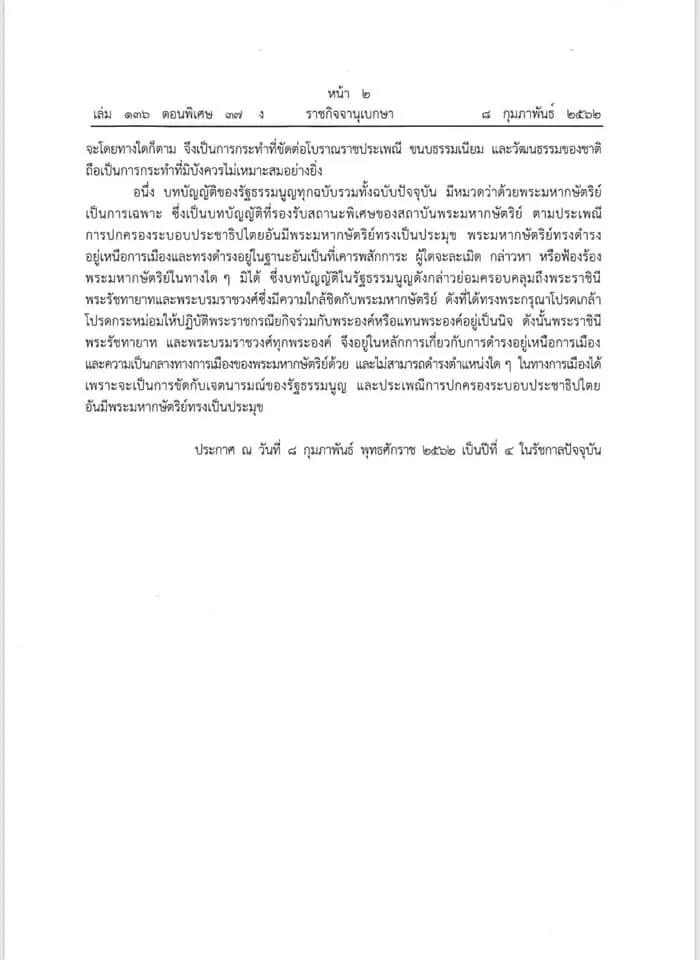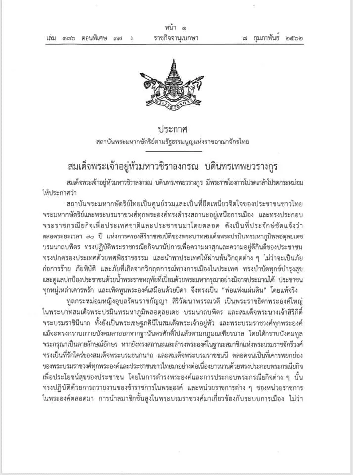 เมื่อเวลาประมาณ 22.40 น. โทรทัศน์รวมการเฉพาะกิจแห่งประเทศไทย ได้เผยแพร่ประกาศสถาบันพระมหากษัตริย์ตามรัฐธรรมนูญ