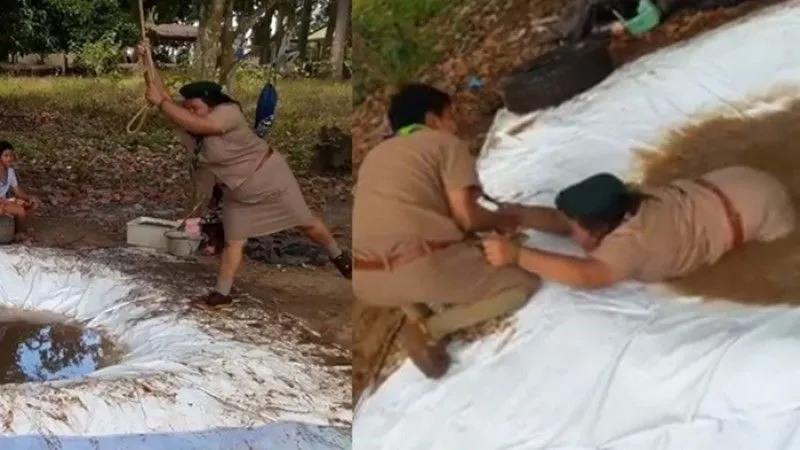 เฟซบุ๊ก "Sky Wiparat Poommeang" ได้ออกมาโพสต์ คุณครูสาวขอทดสอบความเเข็งเเรงของเชือก ในฐานผจญภัยของลูกเสือ โดยโพสต์ดังกล่าวระบุข้อความว่า "ฐานผจญภัย ก่อนถึงนักเรียน ครูต้องลองก่อน" โดยในคลิปนั้นเผยให้เห็นคุณครูโรงเรียนหนึ่ง ที่พาคณะนักเรียนไปเข้าค่ายลูกเสือ แต่เมื่อถึงการทำกิจกรรมเข้าฐานผจญภัย ด้วยความที่คุณครูต้องทดสอบก่อนว่าฐานดังกล่าวจะปลอดภัยสำหรับเด็กนักเรียนหรือไม่ เลยได้ทำการทดสอบความเเข็งเเรงของเชือก เพื่อดูว่าเชือกจะเเข็งเเรงขนาดไหน แถมมีคุณครูท่านอื่นคอยเชียร์และให้กำลังใจในการทดสอบครั้งนี้ แต่แล้วก็ทำเอาเสียงหัวเราะดังสนั่นเมื่อครูสาวคนดังกล่าวเริ่มต้นโหนเชือกเพื่อข้ามฝั่ง โดยที่มีแอ่งน้ำอยู่ตรงกลาง สุดท้ายครูสาวนั้นก็โหนไม่รอดถึงฝั่งตัวพลัดตกลงแอ่งน้ำ แบบไม่ได้เตรียมท่าทางจนหน้าทิ่มลงไป คุณครูผู้ที่ถ่ายคลิปกับผู้ที่อยู่ในเหตุการณ์ดังกล่าว ต่างพากันหัวเราะแบบสะใจ