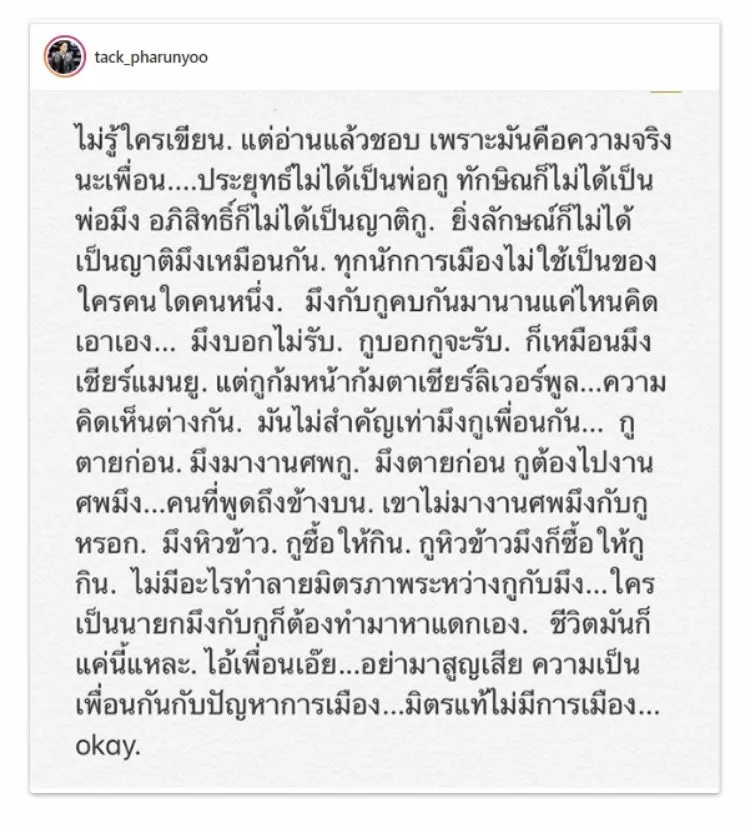 ไอ้เพื่อนเอ๊ย… อย่ามาสูญเสีย ความเป็นเพื่อนกันกับปัญหาการเมือง… มิตรแท้ไม่มีการเมือง.. okay.”