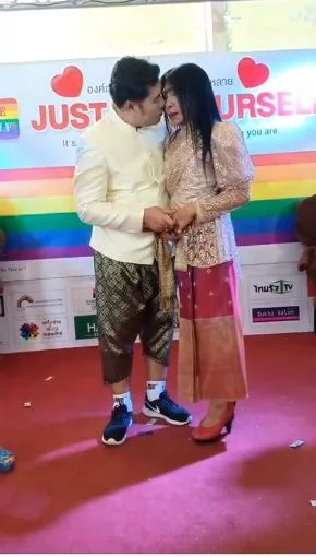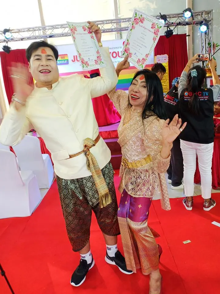 โดยเป็นพิธีแต่งงานเล็กๆที่ถูกจัดขึ้นภายในงานขององค์กรเพื่อมนุษยชนเพศหลากหลาย (Just be Yourself) ที่ TheBazaar สวนลุมไนท์ รัชดา