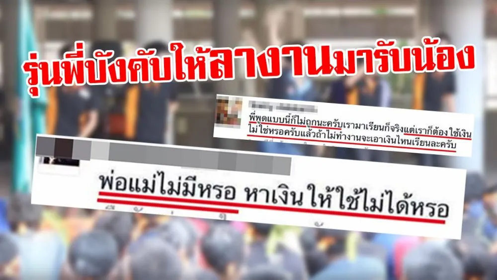 เป็นปัญหาที่อยู่คู่สังคมการศึกษาไทยมานาน กับการรับน้องในบางรุ่นบางสถาบัน ที่คนทั้งโลกไม่อาจเข้าใจได้ ล่าสุดมีรุ่นพี่ที่ยังแบมือขอเงินพ่อแม่อยู่ ได้ประกาศให้รุ่นน้องมาร่วมกิจกรรมที่คาดว่าเป็นส่วนหนึ่งของการรับน้อง โดยกำชับให้รุ่นน้องมากันให้ครบ ถ้าใครตองทำงาน ก็ให้ลางานมาให้ได้ จนมีรุ่นน้องคนหนึ่งกล่าวทำนองว่าตนเองต้องทำงานเพราะจำเป็นต้องใช้เงินในการเรียน