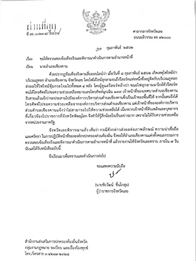 โดยปรากฏข้อเท็จจริงตามสื่อทีวี สื่อออนไลน์ ต่างๆ เมื่อวันที่ 8 กุมภาพันธ์ 2562 ในเรื่องเกิดเหตุไฟไหม้ป่าบริเวณภูทอกอำเภอเชียงคานจังหวัดเลยโดยไฟป่าได้ลุกลามถึงรีสอร์ทแห่งหนึ่งซึ่งติดอยู่กับภูทอกส่งผลให้เกิดไฟไหม้ซุ้มกระโจมไปทั้งหมด 4 หลังโดยผู้ดูแลอ้างว่าขณะไฟลุกลามมาใกล้ตัวรีสอร์ท ตนจึงได้โทรศัพท์ไปขอความช่วยเหลือที่หมายเลข 199 เจ้าหน้าที่ของเทศบาลเชียงคานรับสายแล้วแจ้งประสานงานไปยัง อบตเชียงคาน ซึ่งเป็นเจ้าหน้าที่ พื้นที่ให้บริการ รับผิดชอบ