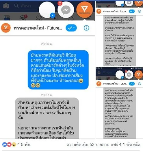ล่าสุด มีแฟนคลับและแฟนเพจของพรรค ถึงขั้นเข้าไป inbox ใน facebook ถาม พรรคอนาคตใหม่ ในเพจผู้ใช้นามว่า Thip Konetsuwan ได้ระบุว่า "ทำไมป้ายหาเสียงถึงน้อยมากๆ และเมื่อพ่อตอบกลับมา .. ได้รับคำตอบว่า จริงที่สุด ทุกการลงทุนต้องมีถอนทุนมาสู้กันด้วยอุดมการณ์ไม่ใช่อำนาจและเงิน!!!! ถึงเวลาที่ประเทศต้องเดินหน้าไม่ใช่ถอยหลังเข้าคลองแล้วละ ใครไม่เลือก .. ฟ้าเลือก ทุกอย่างมีเหตุผลในตัวของมันเอง การเมืองไม่ใช่เรื่องไกลตัว"
