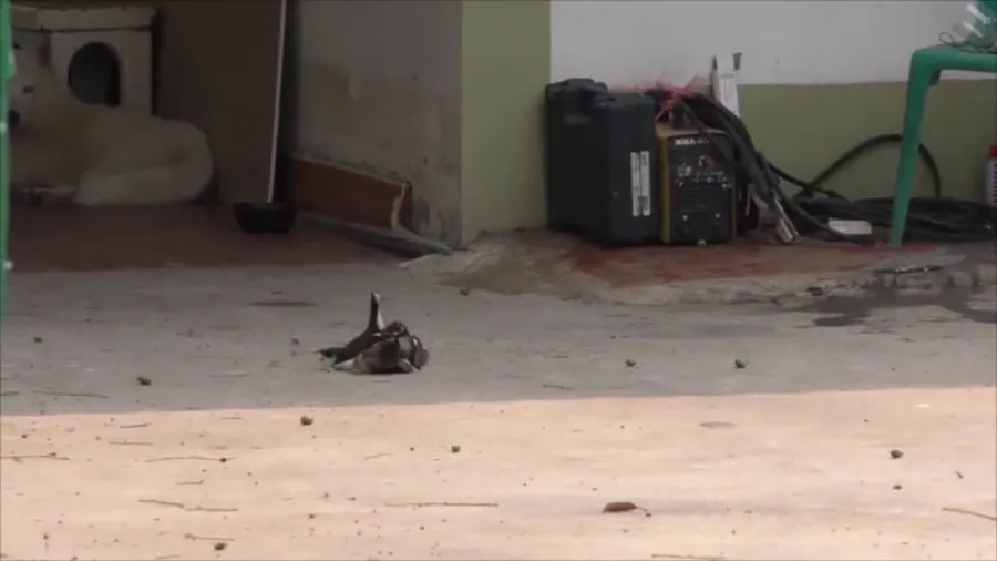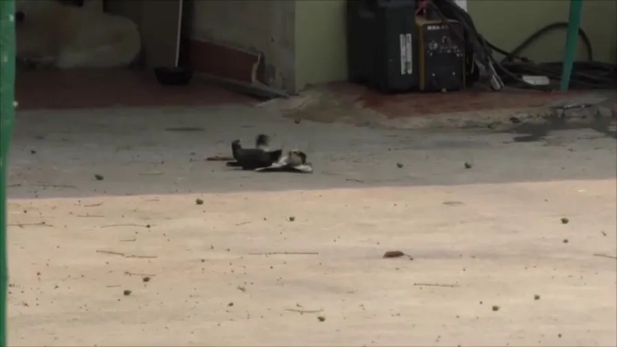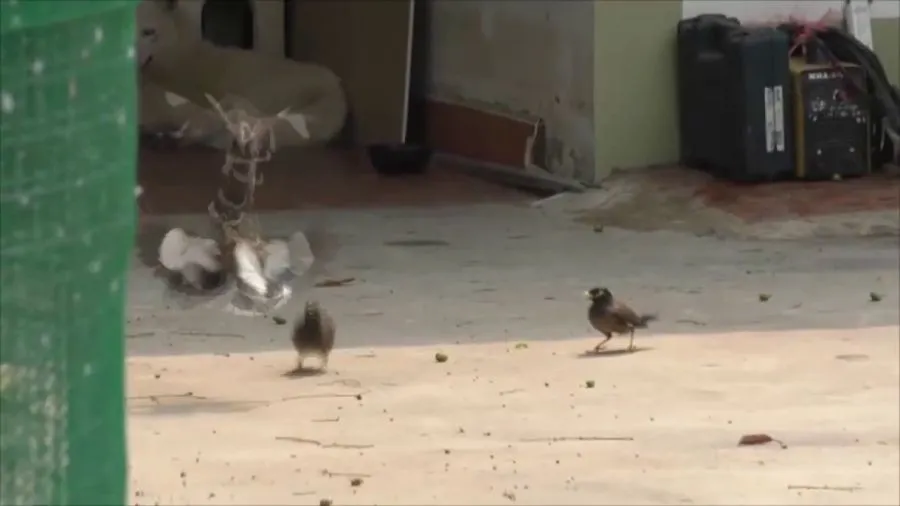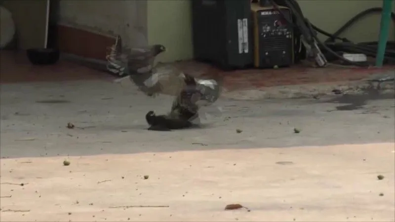 โดยเป็นการจับคู่ต่อสู้กันอยู่พักใหญ่ ก่อนอีกฝ่ายจะล่าถอยไปยืนคุมเชิงอยู่บนหลังคาบ้าน ส่วนคู่นกเอี้ยงที่คาดว่ามีชัยชนะยังคงเดินอยู่ที่พื้นหากินอาหารแบบไม่สนใจฝ่ายตรงข้าม