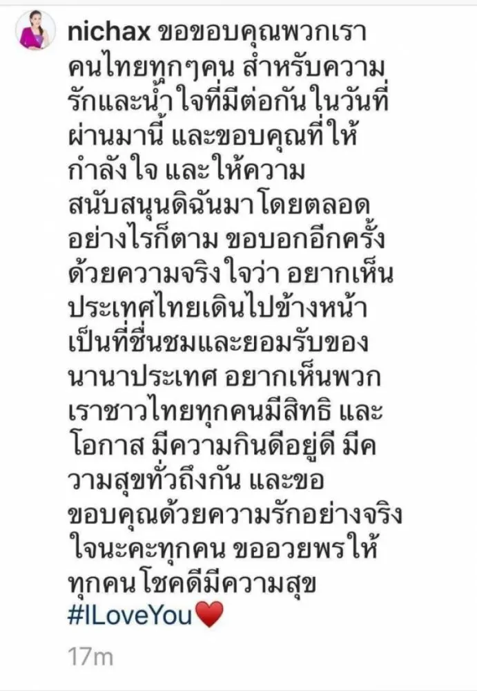 ขอขอบคุณพวกเราคนไทยทุกๆคน สำหรับความรักและน้ำใจที่มีต่อกันในวันที่ผ่านมา และขอบคุณที่ให้กำลังใจ และให้ความสนับสนุนดิฉันมาโดยตลอด อย่างไรก็ตาม ขอบอกอีกครั้งด้วยความจริงใจว่า อยากเห็นประเทศไทยเดินไปข้างหน้า เป็นที่ชื่นชมยอมรับของนานาประเทศ อยากเห็นพวกเราชาวไทยทุกคนมีสิทธิ์และโอกาส มีความกินดีอยู่ดี มีความสุขทั่วถึงกัน และขอขอบคุณด้วยความรักอย่างจริงใจนะคะทุกคน ขออวยพรให้ทุกคนโชคดีมีความสุข #ILoveYou