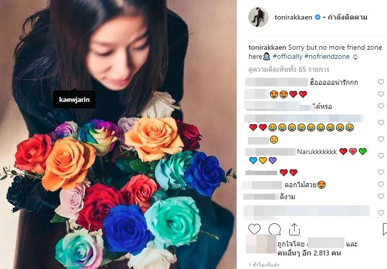 ถูกจับตามองมานานสำหรับความสัมพันธ์ของ "โทนี่ รากแก่น" และ "แก้ว จริญญา" จากภาพที่หลายคนแอบเห็นว่า ทั้งเสื้อผ้า การแต่งกาย ดูเหมือนเป็นชุดคู่กัน แถมช่วงหลังๆ มานี้ หนุ่มโทนี่มักลงรูปสาวแก้ว เยอะจนหลายคนเชียร์ให้คบหาดูใจกัน ล่าสุดวันนี้ (14 ก.พ. 62) ทางสาวแก้ว และหนุ่มโทนี่ ทั้งคู่ลงภาพคู่กับดอกกุหลาบหลากสี พร้อมแคปชั่นยืนยันว่า ข้ามเฟรนด์โซนแล้วนะจ๊ะ