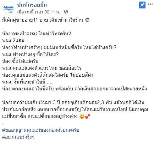 ควันหลงจากวันวาเลนไทน์เมื่อวานนี้ (14 ก.พ.) เฟซบุ๊กแฟนเพจ บันทึกรอยยิ้ม ได้โพสต์เล่าเรื่องราวน่ารักประทับใจของเด็กชายวัย 11 ปี คนหนึ่ง ซึ่งใช้เวลาเก็บเงินถึง 3 ปี มาซื้อกระเป๋าหรู เป็นของขวัญวันวาเลนไทน์ให้คุณแม่
