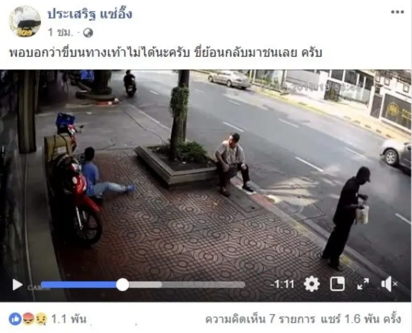 จากกรณีผู้ใช้เฟซบุ๊กชื่อ ประเสริฐ แซ่อึ้ง ได้โพสต์คลิปกล้องวงจรปิด เหตุการณ์ รถจยย.ขี่บนฟุตปาธ แล้วไม่พอใจที่ถูกคนที่ยืนอยู่บนทางเท้าต่อว่า จึงวนรถกลับมาชน ชายคนที่ต่อว่าอย่างจัง จนหงายหลังล้มลงกับพื้น โดยผู้โพสต์ยังได้ระบุข้อความ พอบอกว่าขี่บนทางเท้าไม่ได้นะครับ ขี่ย้อนกลับมาชนเลย ครับ ตามที่เสนอไปก่อนหน้า