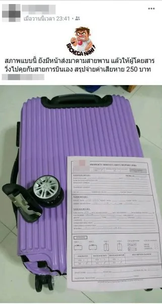 ผู้โดยสารโวย พนักงานสายการบินแห่งหนึ่ง ทำกระเป๋าเดินทางเสียหาย จ่ายแค่ 250 บาท วอนควรดูแลสัมภาระให้ดีกว่านี้