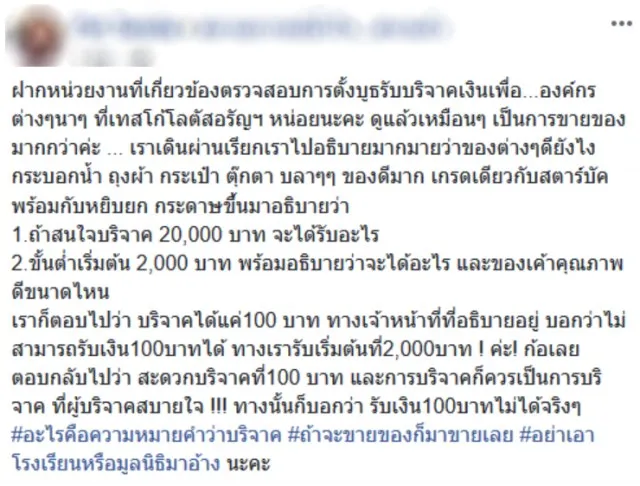 เราก็ตอบไปว่า บริจาคได้แค่100 บาท ทางเจ้าหน้าที่ที่อธิบายอยู่ บอกว่าไม่สามารถรับเงิน100บาทได้ ทางเรารับเริ่มต้นที่2,000บาท ค่ะ ก้อเลยตอบกลับไปว่า สะดวกบริจาคที่100 บาท และการบริจาคก็ควรเป็นการบริจาค ที่ผู้บริจาคสบายใจ ทางนั้นก็บอกว่า รับเงิน100บาทไม่ได้จริงๆ #อะไรคือความหมายคำว่าบริจาค #ถ้าจะขายของก็มาขายเลย #อย่าเอาโรงเรียนหรือมูลนิธิมาอ้าง นะคะ"