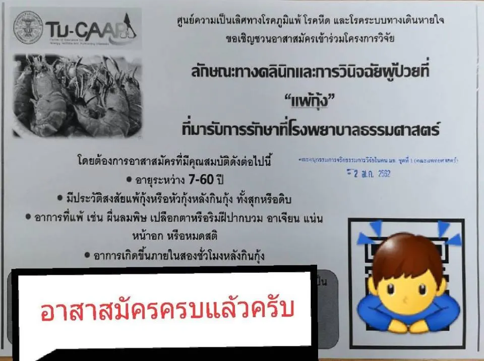 13 ก.พ. 2562 สมาชิกเฟซบุ๊ก New Rujipard ได้โพสต์ข้อความของโรงพยาบาลธรรมศาสตร์เฉลิมพระเกียรติรับสมัครอาสาคนแพ้กุ้งร่วมโครงการวิจัย ระบุ ใครแพ้กุ้งฟังทางนี้!!! คุณอาจกลับไปกินกุ้งได้!!!! ตอนนี้ทางศูนย์ความเป็นเลิศทางด้านโรคภูมิแพ้ โรคหืด และโรคระบบหายใจ มหาวิทยาลัยธรรมศาสตร์ กำลังทำงานวิจัยเกี่ยวกับการแพ้กุ้ง การวิจัยนี้จะทำให้ทราบว่าท่านแพ้กุ้งจริงหรือไม่ หรือแพ้ส่วนไหนจริงๆ โดยทีมแพทย์ รพ.ธรรมศาสตร์เฉลิมพระเกียรติ