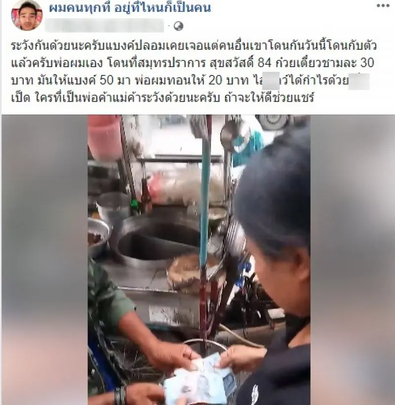 ออกมาเตือนกันอีกแล้วกับปัญหา “แบงค์ปลอม” ระบาด ที่ล่าสุดผู้ใช้เฟซบุ๊กชื่อ “ผมคนทุกที่ อยู่ที่ไหนก็เป็นคน” ได้ออกมาเล่าว่า พ่อของตนโดนมิจฉาชีพในคราบลูกค้าใช้แบงค์ 50 ปลอมมาซื้อก๋วยเตี๋ยวราคา 30 บาท แล้วยังได้เงินทอน 20 บาทไปฟรีๆอีกด้วย โดยระบุว่า…