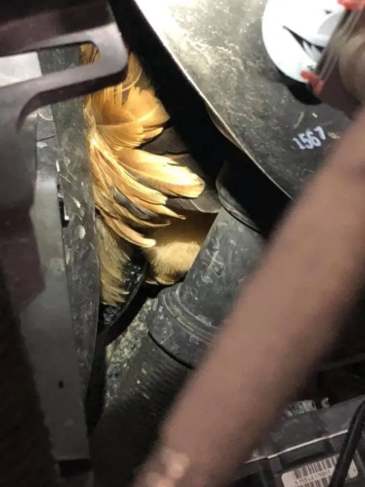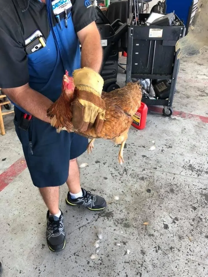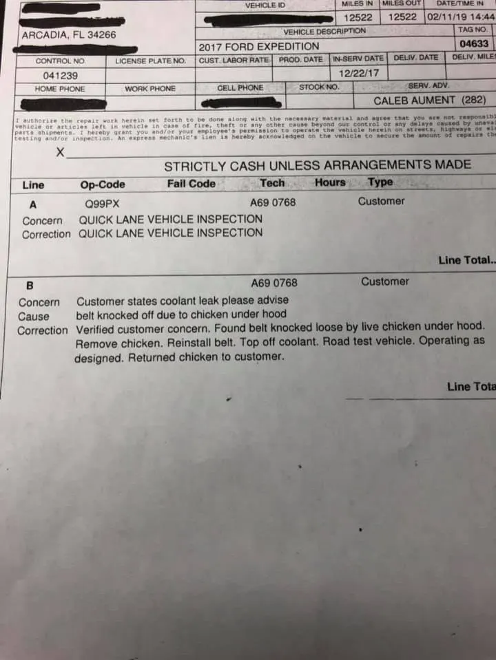 ช่างพบว่าเข็มขัดรัดหม้อน้ำซึ่งเคยล็อกไว้หลวม เพราะว่ามีไก่ตัวหนึ่งบินเข้าไปติดอยู่ภายในนั้น ใบงานที่นำมาแชร์บนเฟซบุ๊กเมื่อวันอังคารที่แล้ว แจ้งผลการซ่อมและทดสอบรถยนต์ว่า วิ่งและทำงานได้เป็นปกติ หลังจากจับไก่ตัวนั้นออกไป รัดเข็มขัดใหม่ และเติมน้ำยาหล่อเย็น และได้ทำการส่งคืนทั้งรถและ “ไก่” ให้แก่ลูกค้าแล้ว โพสต์นี้ถูกแชร์กว่า 2.7 หมื่นครั้ง และมีผู้เข้าไปแสดงความเห็นกว่า 5,000