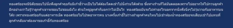 ในตอนแรกเจ้าของร้านพยามไล่ทองสร้อยที่ชอบไปนั่งเก้าอี้ว่างเพื่อฟังบทสนทนาในวงเหล้าเพราะไม่อยากให้มันไปกวนลูกค้าแต่ไปๆมาๆมันกลับเป็นขวัญใจของแขกที่เรียกใช้บริการทุกครั้ง ด้วยท่าทีสุดละเมียด ไม่ยุ่งวุ่นวาย ไม่ปีนโต๊ะ หรือมีท่าทีจะกินอาหาร ทั้งหมดเพียงพอให้ทองสร้อยโดดเด่นผ่านแสงสีวับวาวและดวงตาหลากอารมณ์