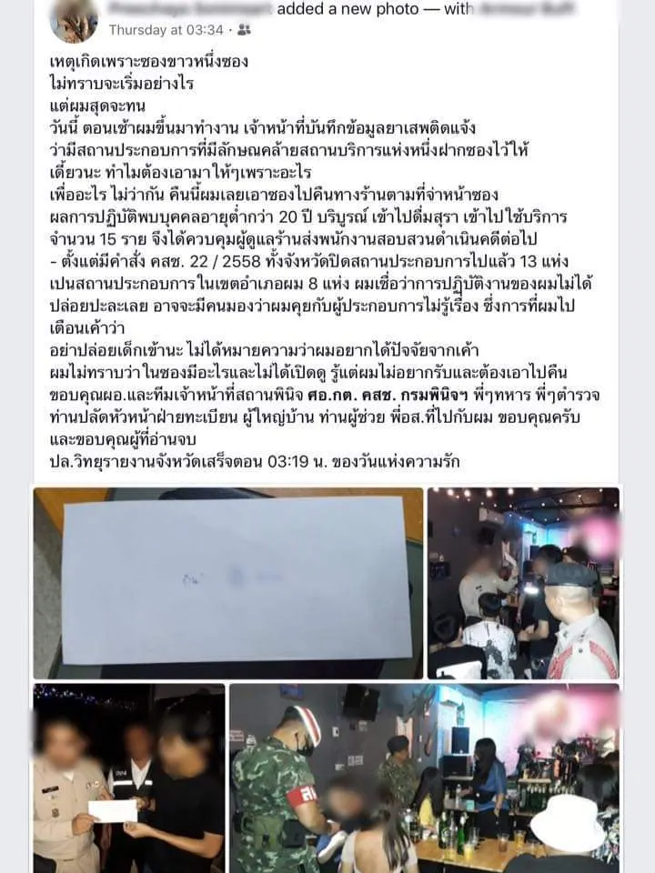“ผลการปฏิบัติพบบุคคลอายุต่ำกว่า 20 ปี เข้าไปดื่มสุรา เข้าไปใช้บริการ จำนวน 15 ราย จึงได้ควบคุมผู้ดูแลร้านส่งพนักงานสอบสวนดำเนินคดีต่อไป”