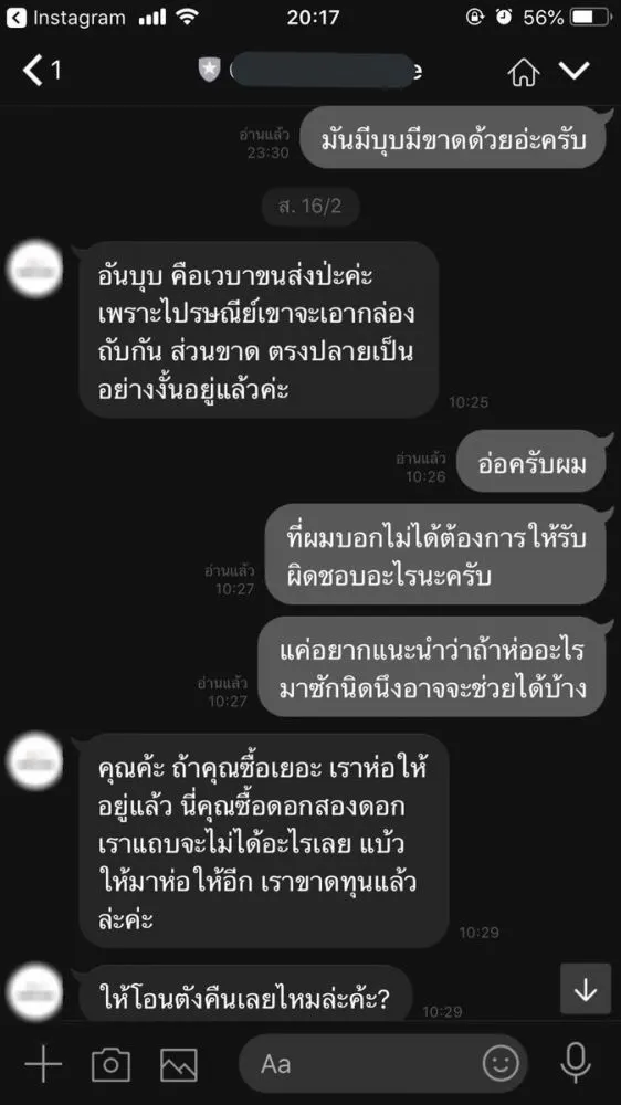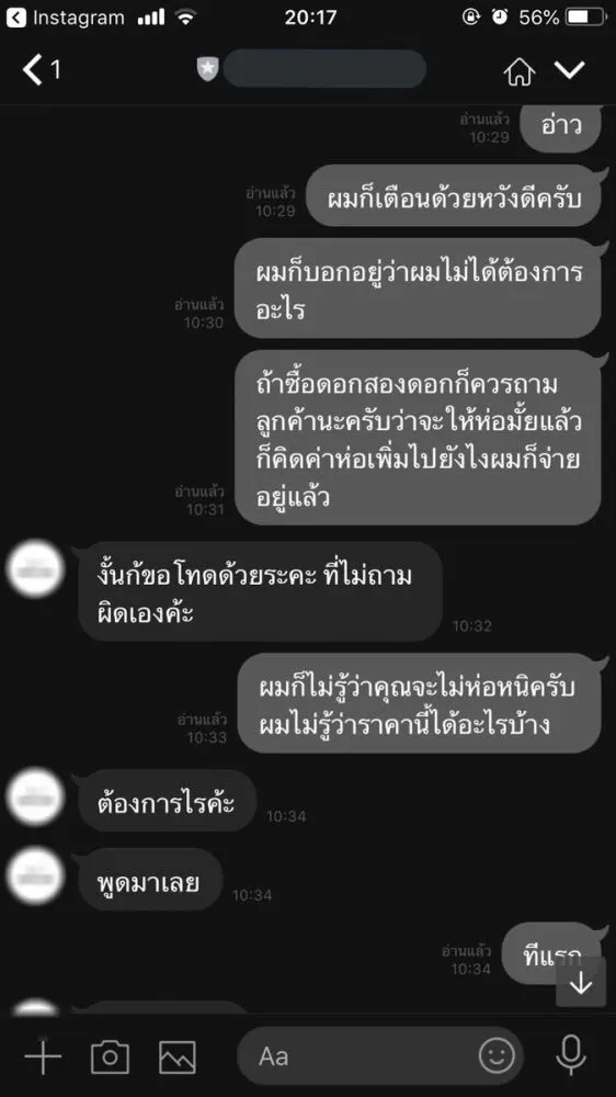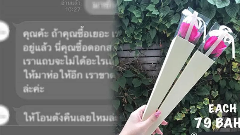 แต่ทางร้านกลับสวนกลับมาว่า "คุณคะ ถ้าคุณซื้อเยอะ เราห่อให้อยู่แล้ว นี่คุณซื้อดอกสองดอก เราแถบจะไม่ได้อะไรเลย แล้วให้มาห่อให้อีก เราขาดทุนแล้วค่ะ ให้โอนตังค์คืนเลยไหมล่ะคะ?"