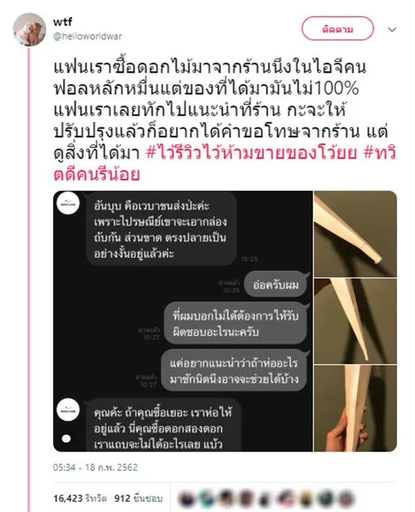 เมื่อวันที่ 18 ก.พ. 62 ที่ผ่านมา ผู้ใช้ทวิตเตอร์คุณ helloworldwar เผยแชทสนทนาระหว่างลูกค้า และแม่ค้าร้านขายดอกไม้ หลังจากดอกไม้ที่ได้กล่องบุบเพราะทางร้านไม่ได้ห่อให้ ใส่กล่องยาวๆมาตามความยาวดอกไม้ สลับแค่หัวสลับท้ายให้มันบาล้านซ์กันเท่านั้น