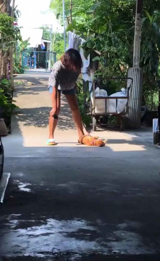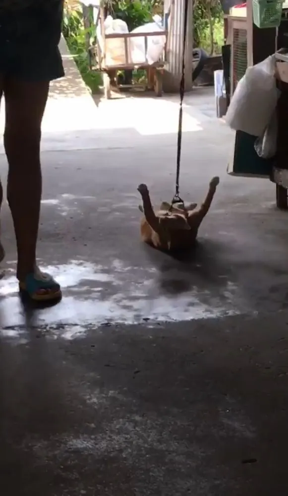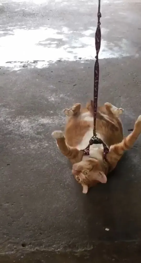 ซึ่งเจ้าเหมียวตัวดังกล่าว ได้ออกไปเดินเล่น โดยที่เจ้าของใส่สายจูงพาออกไปเดินเล่น แต่พอกลับบ้านเท่านั้นและ ทำเป็นนอนไม่ยอมเดิน หงายท้อง เดินไม่เป็นเอาดื้อๆซะงั้น