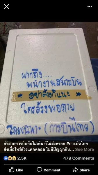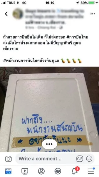 20 ก.พ.62 รายงานข่าวแจ้งว่า ขณะนี้บนโลกโซเชียล ได้มีกระแสวิจารณ์และแชร์เรื่องราวเหตุการณ์หนึ่งเป็นอย่างมาก เมื่อมีสมาชิกเฟสบุ๊ครายหนึ่งที่ใช้ชื่อว่า “Guyz Insorn” ได้โพสต์ภาพและข้อความผ่านทางเฟซบุ๊กของเจ้าตัว ซึ่งเป็นภาพกล่องพัสดุสินค้าเป็นกล่องโฟมที่ส่งผ่านสายการบินหนึ่งต้นทางจากจังหวัดเชียงราย ไปยังหาดใหญ่ จังหวัดสงขลา แต่เจ้าตัวได้มีการเขียนข้อความตัวหนังสือสีน้ำเงินขนาดใหญ่จนเห็นได้ชัดเจนเพื่อย้ำเตือนพนักงาน ซึ่งระบุบนกล่องพัสดุดังกล่าวว่า “ฝากถึง…..พนักงานสนามบิน อย่าล้วงกินนะ ใครล้วงพ่อตาย โดยเฉพาะ (การบินไทย)” แล้วได้ถ่ายภาพดังกล่าวโพสต์เช็คอินสนามบินแม่ฟ้าหลวง จังหวัดเชียงราย ซึ่งภายหลังโพสต์ดังกล่าวถูกเผยแพร่ไปนั้น ได้มีกระแสวิพากษ์วิจารณ์ถึงเรื่องราวนี้เป็นจำนวนมาก อีกทั้งยังมีการแชร์โพสออกไปอย่างแพร่หลายในขณะนี้