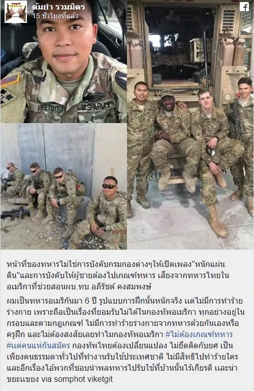 โซเชียลแชร์ หนุ่มไทยที่เป็นทหารอเมริกัน 6ปี ได้พูดถึงการทำหน้าที่ทหารที่อเมริกา และแนะว่ากองทัพไทยต้องเปลี่ยนแปลง ไม่ยึดติดกับยศเป็นเพียงคนธรรมดาคนหนึ่งที่อาสารับใช้ชาติ ไม่มีสิทธิไปทำร้ายใคร การทำร้ายร่างกายพลหทาร ถือเป็นเรื่องที่ยอมรับไม่ได้ในกองทัพอเมริกา ทุกอย่างอยู่ในกรอบและตามกฎเกณฑ์ และไม่ต้องเกณฑ์ทหาร เเต่คนแห่กันสมัคร ชี้ พลทหารที่ถูกนายสั่งให้ไปรับใช้ที่บ้านนั้น ไร้เกียรติ เเละน่าขยะเเขยง