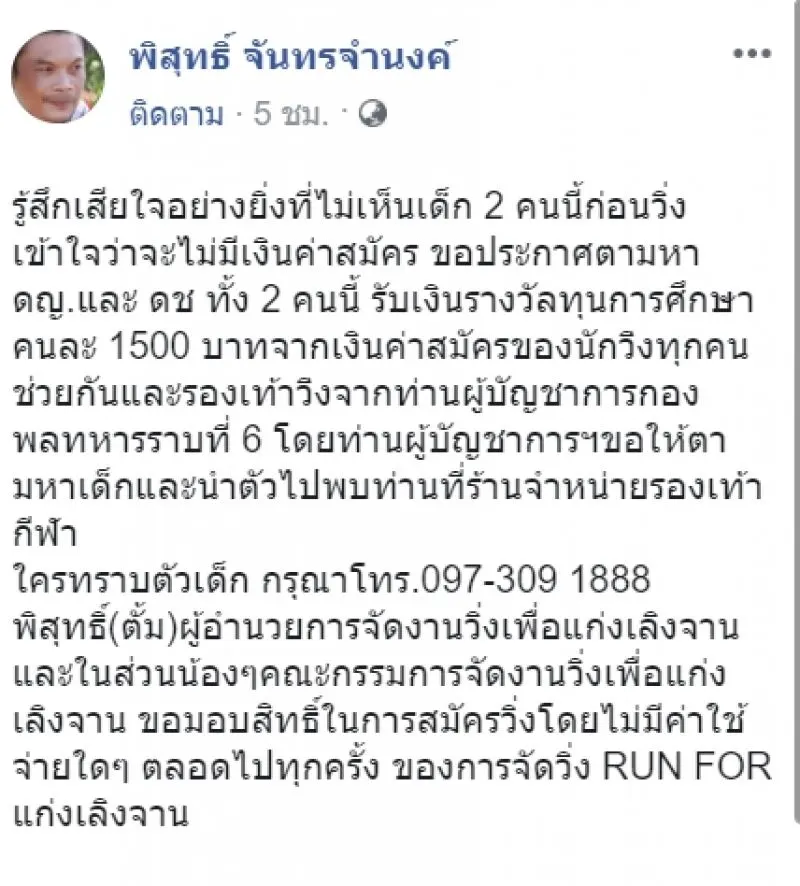 สืบเนื่องจากกรณีที่ ในโลกโซเชียลได้มีการแชร์ข้อความที่ผู้ใช้เฟซบุ๊กชื่อ "พิสุทธิ์ จันทรจำนงค์" ได้เปิดเผยเรื่องราวของเด็ก 2 คน พร้อมระบุว่า รู้สึกเสียใจอย่างยิ่งที่ไม่เห็นเด็ก 2 คนนี้ก่อนวิ่ง เข้าใจว่าจะไม่มีเงินค่าสมัคร ขอประกาศตามหา ด.ญ.และ ด.ช. ทั้ง 2 คนนี้ รับเงินรางวัลทุนการศึกษาคนละ 1500 บาท จากเงินค่าสมัครของนักวิ่งทุกคนช่วยกันและรองเท้าวิ่งจากท่านผู้บัญชาการกองพลทหารราบที่ 6 โดยท่านผู้บัญชาการฯขอให้ตามหาเด็กและนำตัวไปพบท่านที่ร้านจำหน่ายรองเท้ากีฬานั้น
