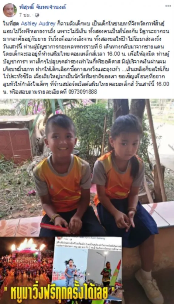 โดยในเวลาต่อมาภายหลังจากที่มีการประกาศตามหาเด็กทั้ง 2 คน ล่าสุด ผู้ใช้เฟซบุ๊กชื่อ "พิสุทธิ์ จันทรจำนงค์" ได้มีการเปิดเผยความคืบหน้าว่า ในที่สุด Ashley Audrey ก็ตามตัวเด็กพบ เป็นเด็กในชนบทที่จังหวัดกาฬสินธุ์ แอบไปวิ่งฟรีหลายงานวิ่ง เพราะไม่มีเงิน ทั้งสองคนเป็นพี่น้องกัน มีฐานะยากจนมากอาศัยอยู่กับยาย วันวิ่งเพื่อแก่งเลิงจาน ทั้งสองขอให้ป้าไปรับมาส่งลงวิ่ง