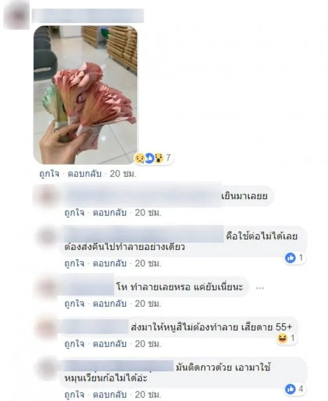 ในขณะเดียวกัน หลายคนต่างก็เข้าใจและให้ความร่วมมือ แต่ก็มีอีกหลายคนที่ยังคงมองว่าเรื่องนี้ ควรจะเป็นหน้าที่ของพนักงานธนาคาร ที่จะต้องดูแลและแก้ไขปัญหาเอาเอง อย่างเช่นผู้ใช้เฟสบุ๊คท่านหนึ่งที่เข้ามาแสดงความคิดเห็นอีกด้าน ทำให้กลายเป็นที่ถกเถียงกันขึ้นมา ถึงเรื่องของจิตสำนึก เพราะความเสียหายที่เกิดขึ้นกับธนบัตรนั้น เป็นความตั้งใจให้เกิดไม่ใช้เป็นการเสื่อมตามอายุการใช้งาน