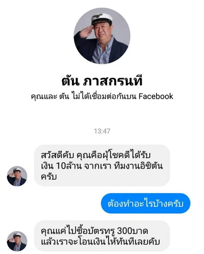 และก็ไม่วายยังมีอิจฉาชีพนำมาใช้ซ้ำอีกจนได้ โดยมิจฉาชีพผู้นี้ได้อินบ็อกเข้ามาหาชายคนหนึ่งว่า เป็นผู้โชคดีได้เงินรางวัล 10 ล้านบาท โดยให้ไปซื้อบัตรเติมเงินมาแล้วจะโอนเงินรางวัลให้ทันที แต่เนื่องจากมุขนี้มันถูกใช้บ่อยแล้วทำให้ชายหนุ่มรู้ทัน เลยขอผสมโรงพร้อมกับขอปั่นสักหน่อย ทำเอามิจฉาชีพรายนี้ไปแทบไม่เป็น