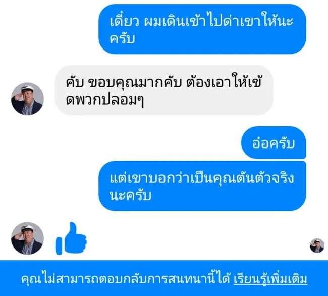 สุดท้ายเมื่อมิจฉาชีพเจอปั่นจนจะเป็นจิ้งหรีดอยู่แล้ว ก็เลยชูนิ้วโป้งให้และบล็อกไปตามระเบียบ