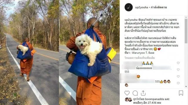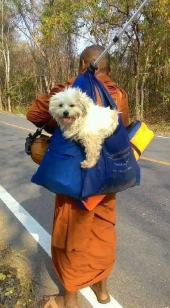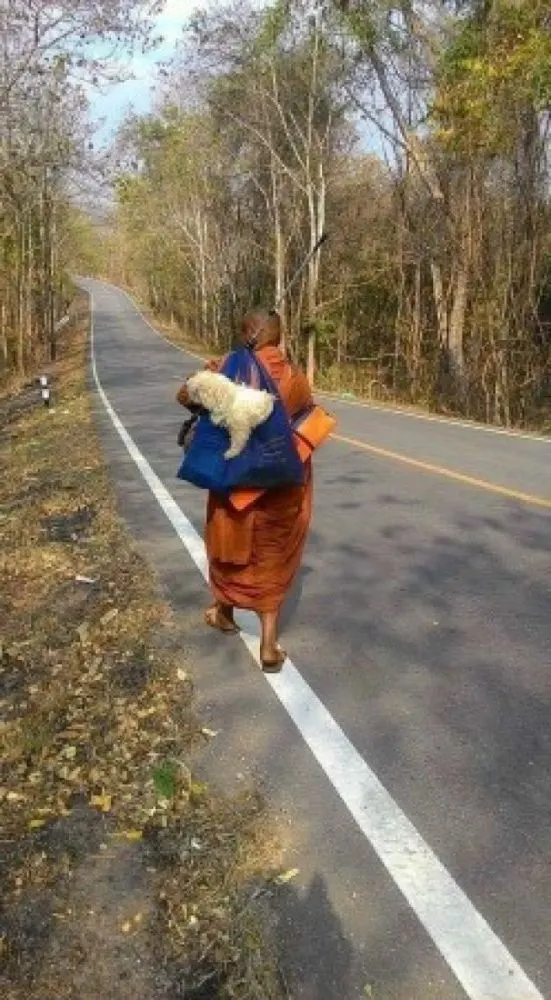 ขับมอไซค์ทำธุระแถวบ้าน เจอพระเดินธุดงค์รูปหนึ่งโดยมีน้องหมาตัวเล็กๆ เดินตามมาติดๆ เลยหาซื้อน้ำแล้ววนรถกลับไปถวาย พอกลับมาอีกทีน้องไปอยู่ในย่ามเรียบร้อย หลังจากให้ศีลให้พร หลวงพ่อเล่าให้ฟังว่าเดินธุดงค์มาจากเชียงราย ผ่านมาทางแม่ฮ่องสอน โดยมีเจ้าตัวเล็กชื่อแก้มตามสอยห้อยติดมาแบบนี้หลายปีแล้ว น่ารักมากๆ
