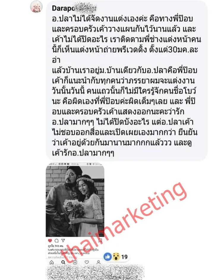ล่าสุด ชาวเน็ตคนนึงเป็นคนหมู่บ้านเดียวกันกับเจ้าสาวอ.ปลา ได้เผยความจริงเรื่องความสัมพันธ์ว่า