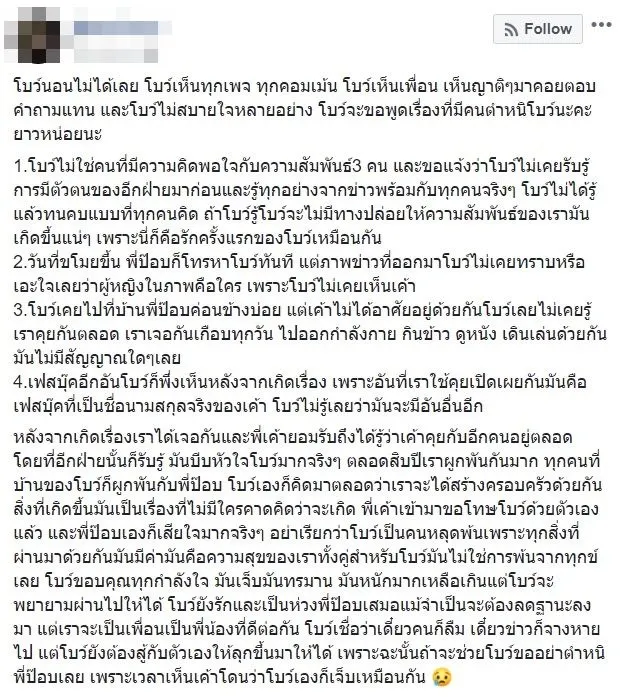 ล่าสุด (24 กุมภาพันธ์ 2562) สาวโบว์ ได้ออกมาเปิดใจชี้แจงผ่านเฟซบุ๊กส่วนตัว เล่าความจริงทุกอย่างและความรู้สึกของตัวเอง โดยตลอดเวลาที่ผ่านมา ตัวเองไม่เคยรับรู้มาก่อนว่าฝ่ายชายมีคนอื่น ไม่ได้รู้แล้วทนเหมือนที่คนอื่นคิด ถ้ารู้ว่าเป็นความสัมพันธ์ 3 คน คงไม่มีทางยอมทน เพราะความรักครั้งนี้คือรักครั้งแรกของตัวเอง