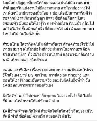 อีกทั้งยังขอให้มีการตัดนิ้วก้อยเพื่อเป็นการพิสูจน์ว่าจะรักษาสัญญา สื่อความหมายว่าเมื่อทำอะไรลงไปแล้วไม่สามารถกลับไปแก้ไขได้ จนถึงขั้นเอาเลือดล้างเท้าสามีและกราบเพื่อขอขมา สุดท้าย เจ้าของโพสต์ ทิ้งท้ายว่าจะขอไปเกิดใหม่