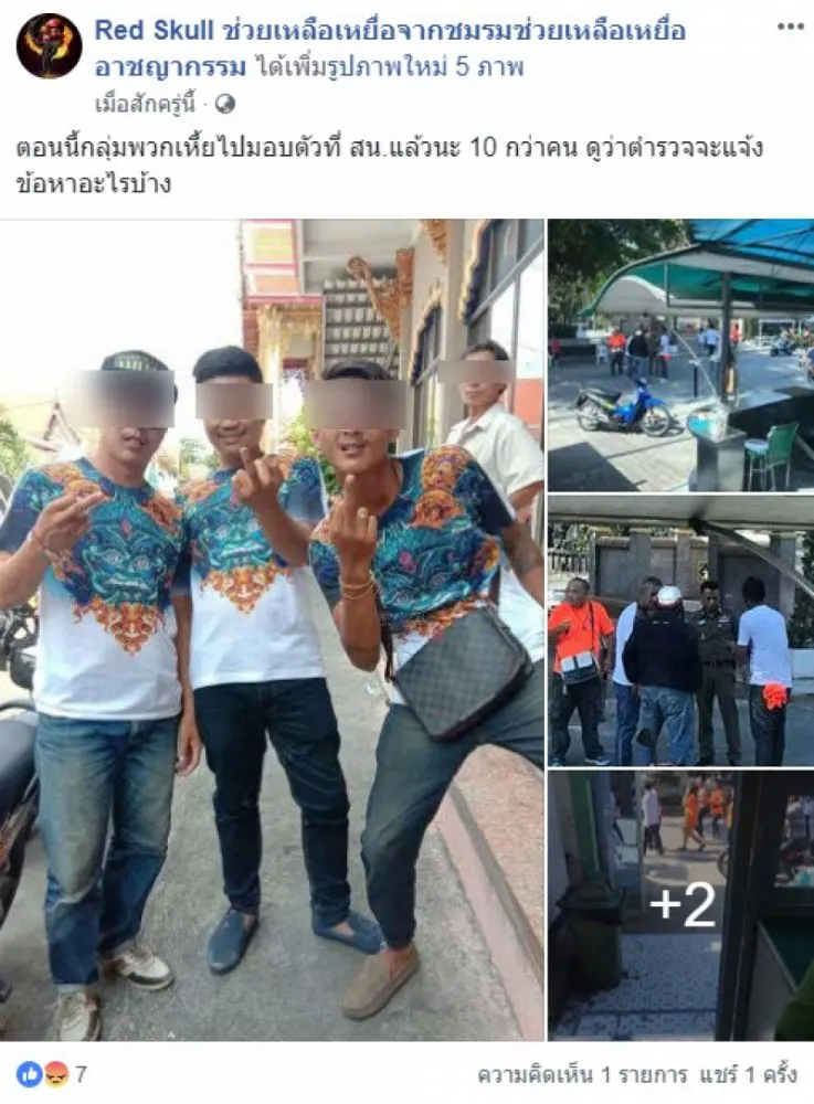 ล่าสุดในเพจ Red Skull ช่วยเหลือเหยื่อจากชมรมช่วยเหลือเหยื่ออาชญากรรม โพสต์ข้อความระบุว่า ตอนนี้กลุ่มพวกเ...้ยไปมอบตัวที่ สน.แล้วนะ 10 กว่าคน ดูว่าตำรวจจะแจ้งข้อหาอะไรบ้าง