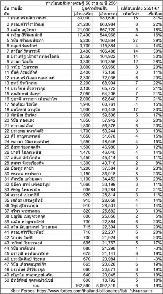 3. อภิมหาเศรษฐี 50 อันดับแรกนี้ มีสินทรัพย์รวม กัน 5,092,319 ล้านบาท หรือมากกว่างบประมาณแผ่นดินไทยที่ 3 ล้านล้านบาทถึง 70% หรือเกือบเท่าตัว ทรัพย์สินของ 50 อภิมหาเศรษฐีนี้เพิ่มจาก 876,585 ล้านบาทเมื่อ 10 ปีก่อน หรือรวยเพิ่มขึ้น 6 เท่าโดยเฉลี่ย ปีหนึ่งรวยขึ้นประมาณ 19% สิ่งที่น่าสนใจเป็นอย่างยิ่งก็คือว่าทำไมรวยเอาๆ ได้ขนาดนี้ เมื่อเทียบกับรายได้ของประชากรในรอบ 10 ปีที่ผ่านมา เฉพาะกรุงเทพมหานคร ครัวเรือนไทยมีรายได้เพิ่มขึ้น 17% หรือเพียง 1.6% ต่อปี https://bit.ly/2foScXj) เท่านั้น ถ้าเป็นตัวเลขทั่วประเทศ คงมีรายได้เพิ่มน้อยกว่านี้ การที่อภิมหาเศรษฐีรวยเร็วขนาดนี้ แสดงถึงอาการ "รวยกระจุก จนกระจาย" อย่างชัดเจน
