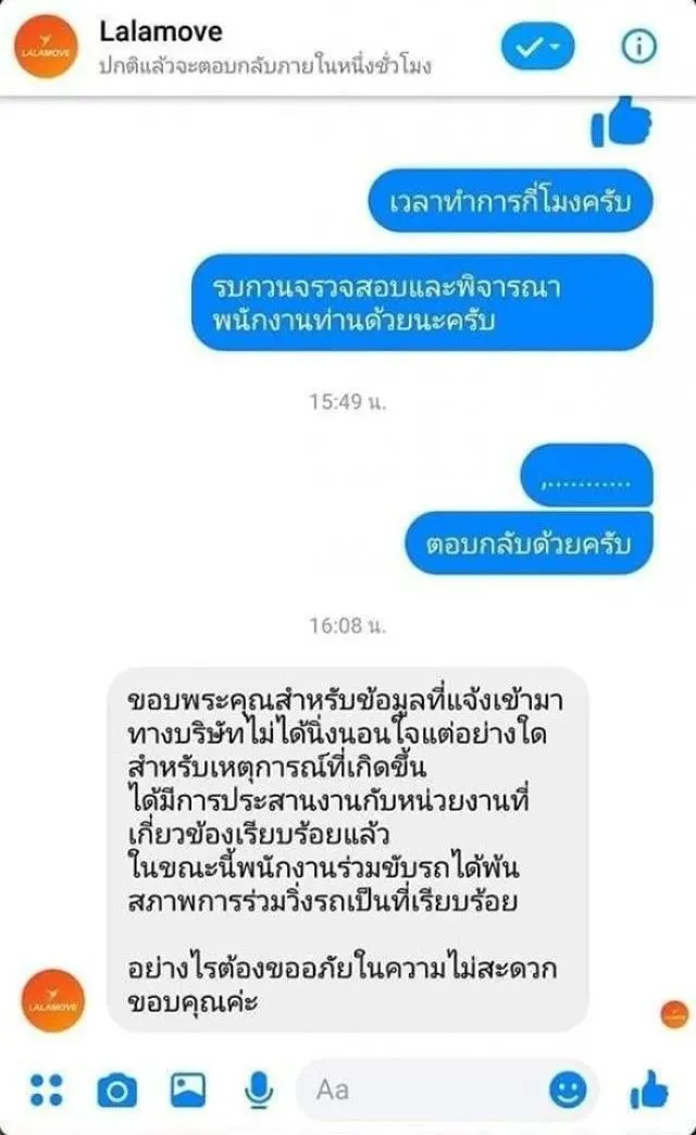 "ขอบพระคุณสำหรับข้อมูลที่แจ้งเข้ามา ทางบริษัทไม่ได้นิ่งนอนใจแต่อย่างใด สำหรับเหตุการณ์ที่เกิดขึ้น ได้มีการประสานงานกับหน่วยงานที่เกี่ยวข้องเรียบร้อยแล้ว ในขณะนี้พนักงานร่วมขับรถได้พ้นสภาพการร่วมวิ่งรถเป็นที่เรียบร้อย อย่างไรต้องขออภัยในความไม่สะดวก ขอบคุณค่ะ"