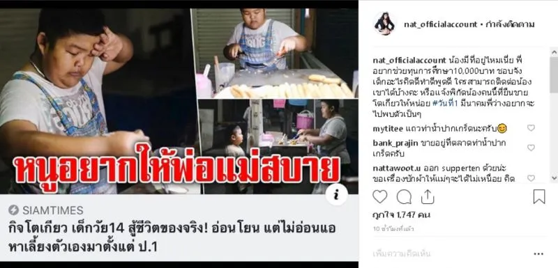 ล่าสุด เพจผู้ใช้อินสตาแกรมชื่อ nat_officialaccount แนท เกศริน ก็ได้โพสต์ข้อความผ่านอินสตาแกรมส่วนตัว ที่ยื่นมือช่วยเหลือน้องกิจ โดยได้ระบุข้อความว่า น้องมีที่อยู่ไหมเนี่ย พี่อยากช่วยทุนการศึกษา 10,000 บาท ชอบจังเด็กอะไรคิดดีทำดีพูดดี ใครสามารถติดต่อน้องเขาได้บ้างคะ หรือแจ้งพิกัดน้องคนนี้ที่ยืนขายโตเกียวให้หน่อย #วันที่ 1 มีนาคมพี่ว่าง อยากจะไปพบตัวเป็นๆ