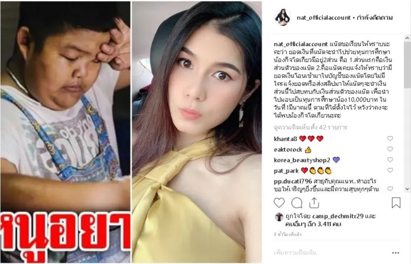 และยังโพสต์ต่ออีกว่า แนทขอเรียนให้ทราบนะคะว่า ยอดเงินที่แนทจะนำไปช่วยทุนการศึกษาน้องกิจโตเกียวมีอยู่ 2 ส่วน คือ 1.ส่วนแรกคือเงินส่วนตัวของแนท 2.คือแนทเคยแจ้งให้ทราบว่ามียอดเงินโอนเข้ามาในบัญชีของแนท โดยไม่มีใครแจ้งยอดหรือส่งสลิปมาให้แนท แนทจะนำเงินส่วนนี้ไปสบทบกับเงินส่วนตัวของแนท เพื่อนำไปมอบเป็นทุนการศึกษาน้อง 10,000 บาท ในวันที่ 1 มีนาคมนี้ ตามที่ได้ตั้งใจไว้ หวังว่าคงจะได้พบน้องกิจโตเกียวนะคะ