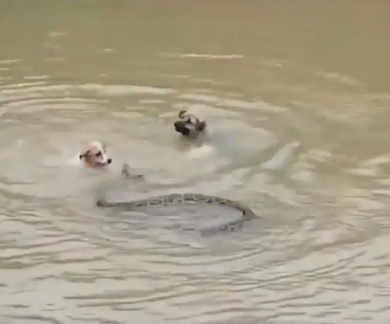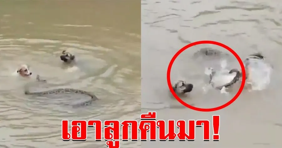 เอาลูกคืนมา ศึกระหว่างงูเหลือมตัวใหญ่ กับ เจ้าตูบสองตัว สู้ในน้ำอย่างดุเดือด