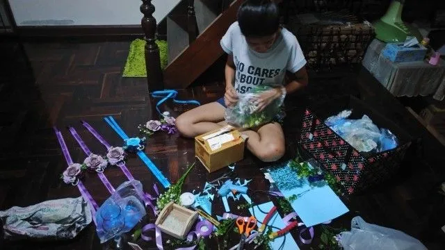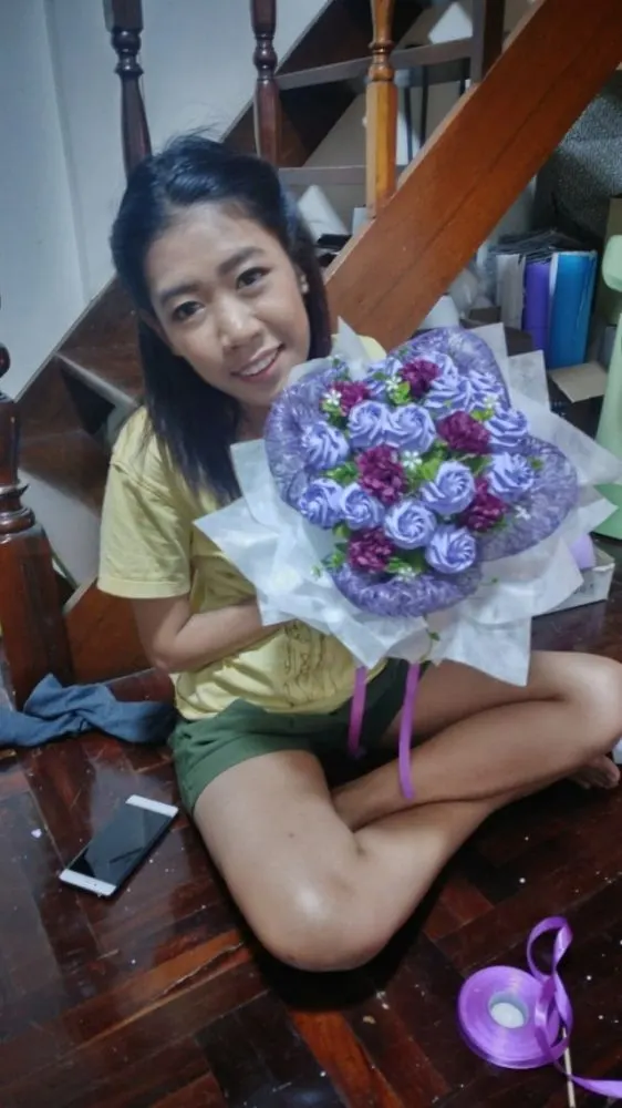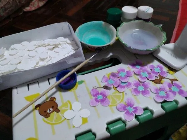 การลงสีดอกไม้ลองผิดลองถูกเยอะมากกกกกจะใช้เครื่องเพ้นสีก็ราคาสูง ส่วนฉีดสเปย์สีดอกไม้ไม่เสมอและเหม็นมาก จึงมาจบที่ฟองน้ำจุ่มสีผสมอาหาร(บอกเลยต้องใช้ความอดทนสูงมากกก)